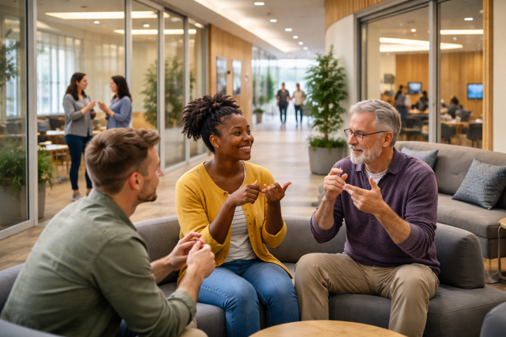 - Space for signing: Sign language needs room. DeafSpace makes sure there’s enough space for people to sign comfortably and see each other clearly.