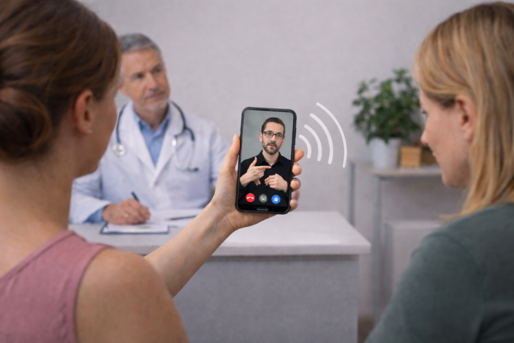 The deaf person opens the app and connects to an interpreter. The interpreter appears on the screen and can see the deaf person signing. When the deaf person needs to talk with someone who doesn’t know sign language, the interpreter assists them to communicate[3].